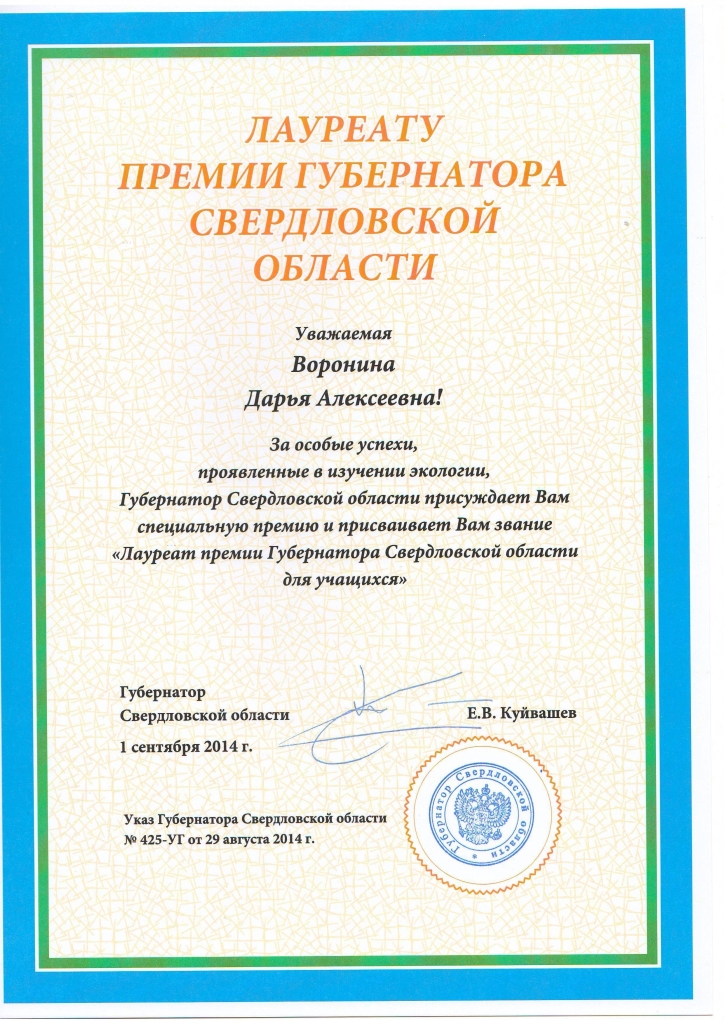 Поздравляем Воронину Дарью, ученицу 10-А класса, которая за заслуги в изучении  биологии и экологии была удостоена столь высокой награды, ее родителей и  учителя биологии Лобанову Т. В.