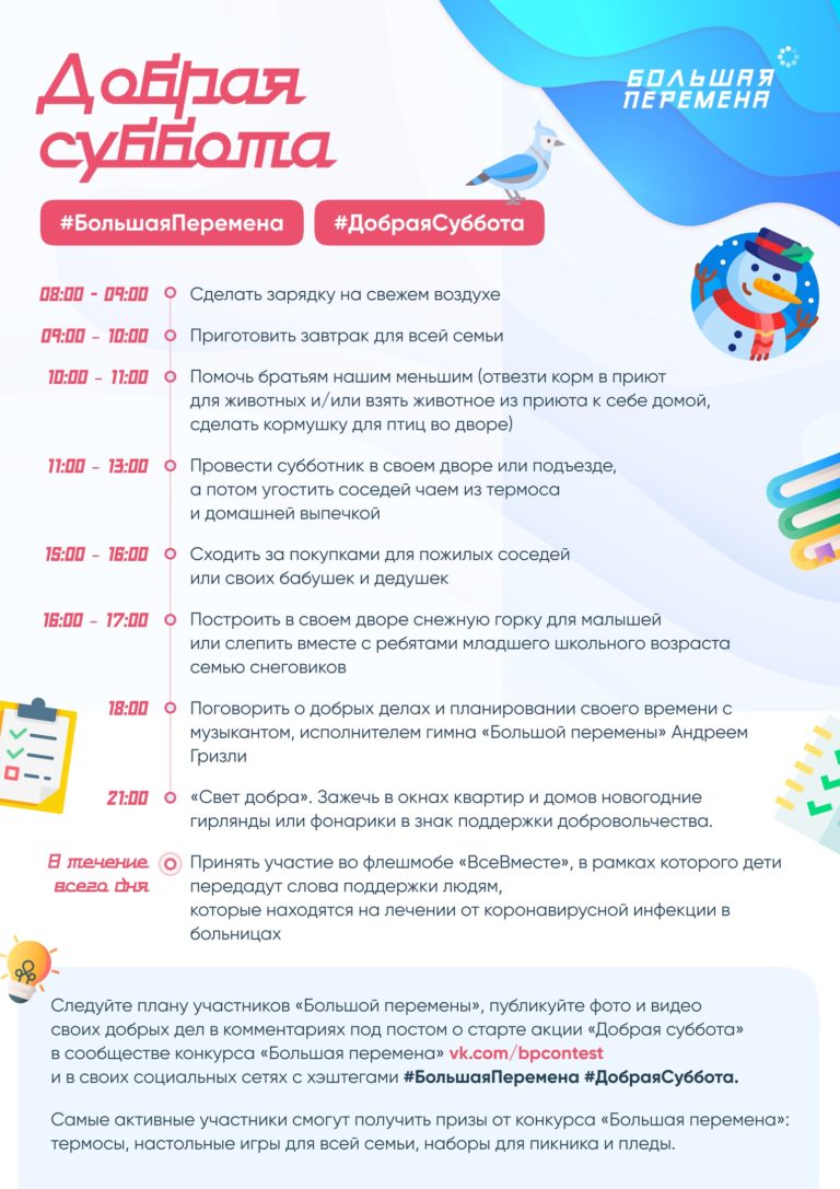 Акция «Добрая суббота» пройдет впервые 23 января 2021 года и предоставит возможности для самореализации ребят в среде волонтерства и социального проектирования. Акция станет традиционной и будет проводиться еженедельно в сообществе конкурса «Большая перемена».