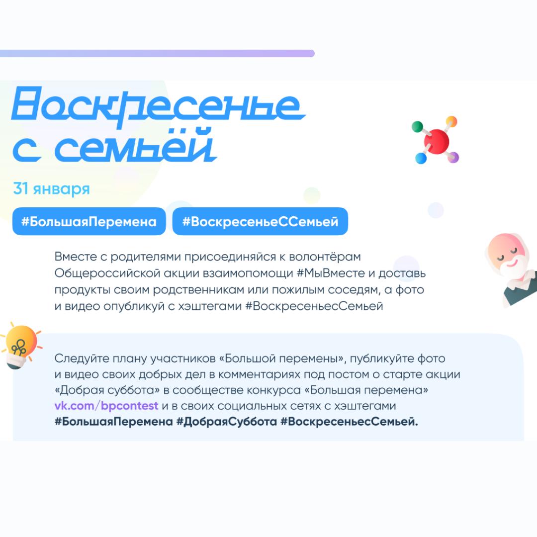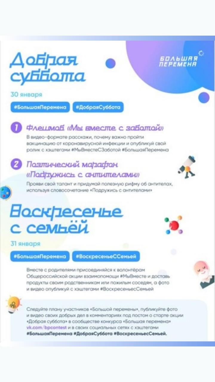 22 января 2021 года в сообществе Всероссийского конкурса для школьников «Большая перемена» социальной сети ВКонтакте (https://vk.com/bpcontest) стартует Всероссийская акция «Добрая суббота». Инициаторами акции выступили участники «Большой перемены», они предложили всем школьникам и их родителям начать новый год с добрых дел и полезных привычек.