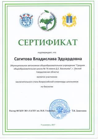 Поздравляем обучающуюся 9В класса Сагитову Владиславу с очень достойным участием во Всероссийской олимпиаде школьников по биологии в г. Ульяновск. Благодарим учителя биологии Лобанову Т.В. за подготовку ученицы.
